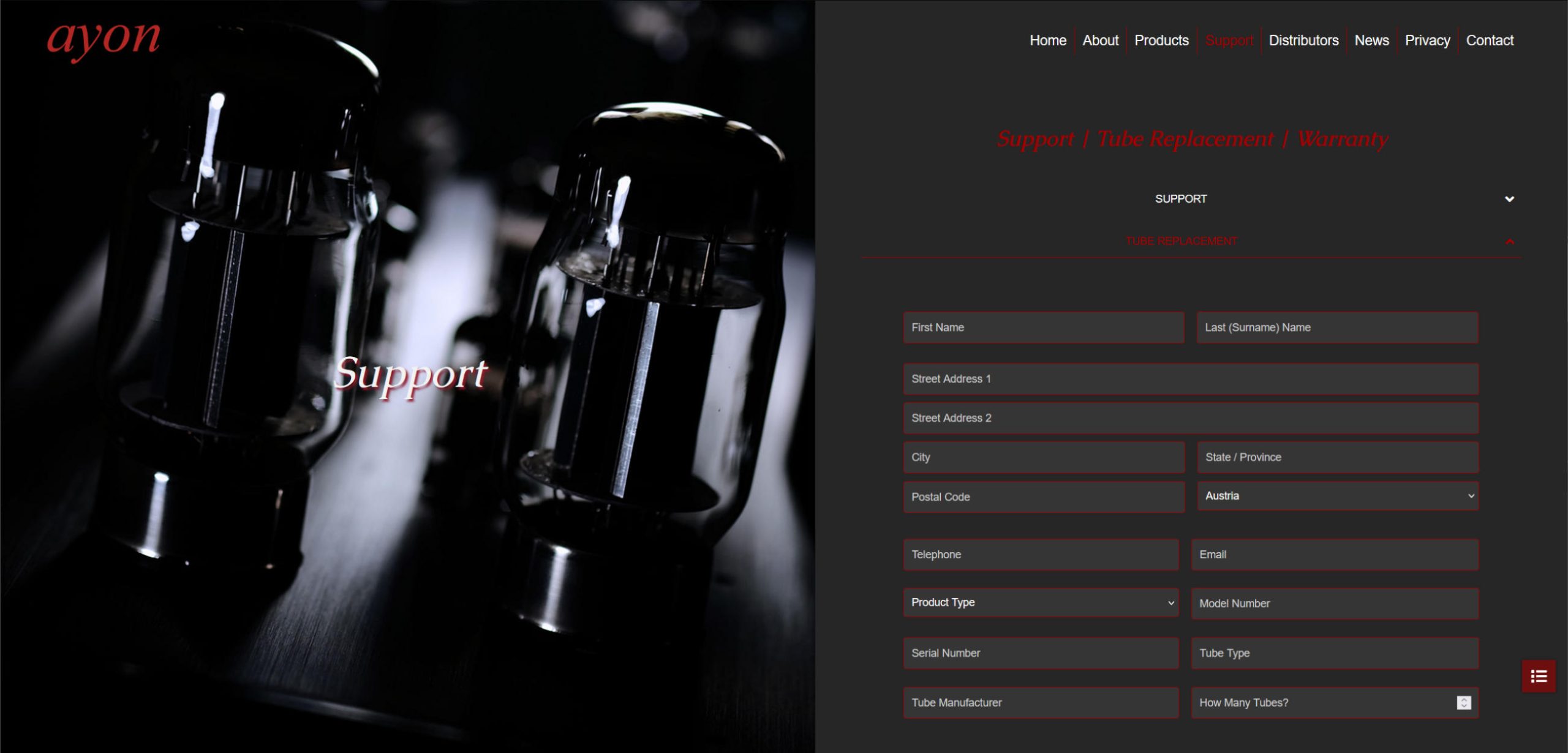 Multiple advanced forms for support, warranty and downloads